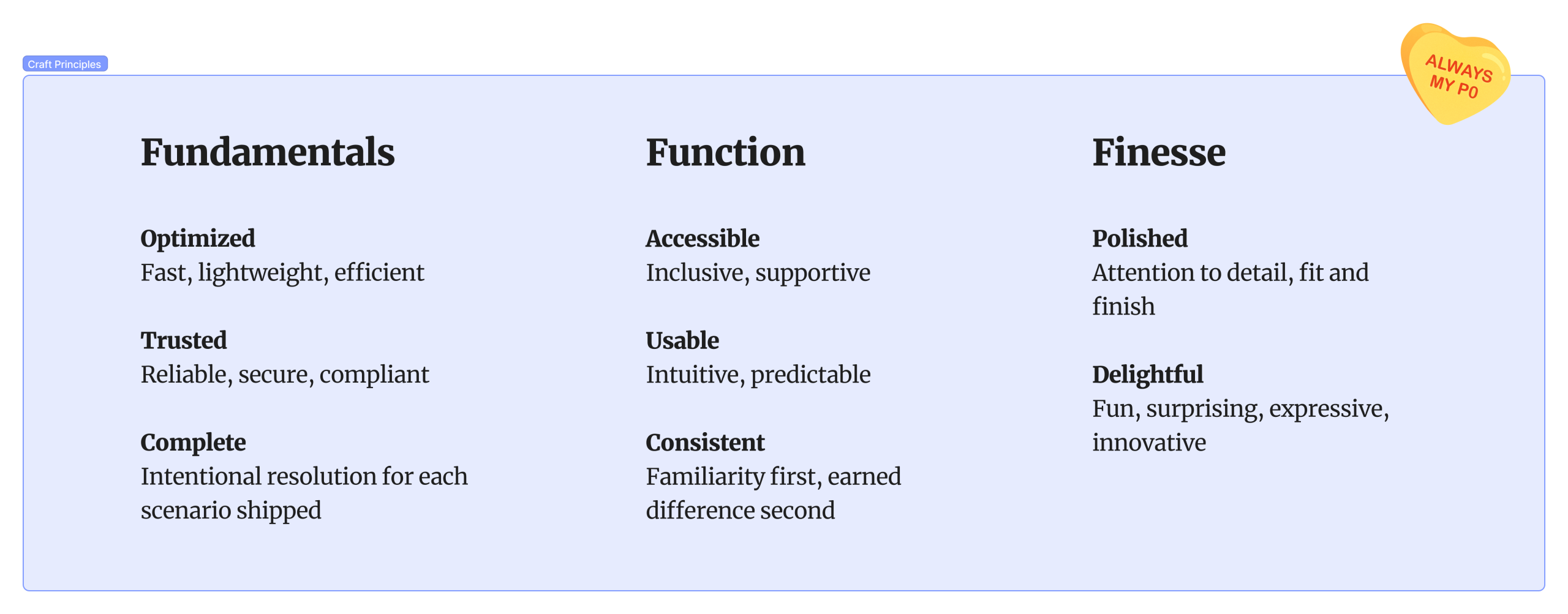Without standards or tooling, Craft was treated as an afterthought. That meant fragmented experiences, reactive fixes, and missed opportunities to exceed user expectations. This initiative aimed to operationalize Craft through shared language, structured planning, and new review processes, elevating product quality, reducing rework, and building trust with users at scale.