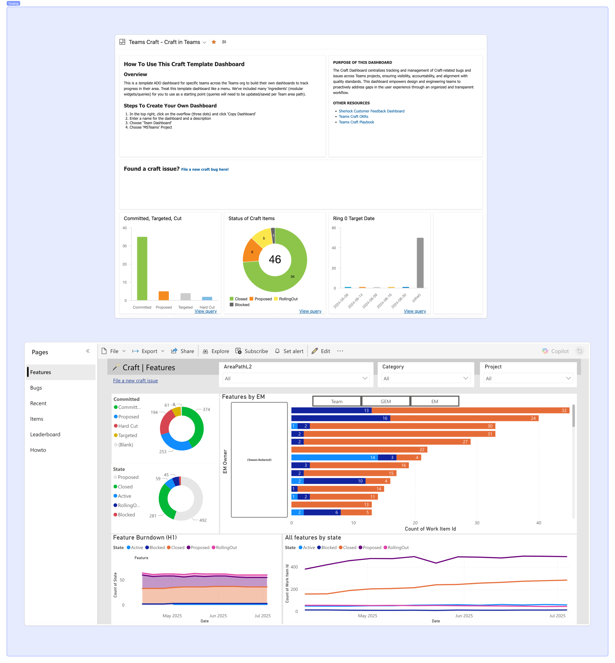 From there, I led design and development of two primary tools. Craft Dashboards in Power BI and Azure DevOps tracked Craft-related issues across the product lifecycle. A new Craft taxonomy for Sherlock (our internal AI tool for customer feedback) directly connected customer signals to our defined Craft categories.